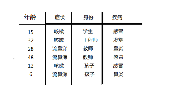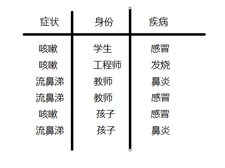 现在假设来又来了一个人是症状为咳嗽的教师,那这位教师是患上感冒、发烧、鼻炎的概率分别是多少呢?这个问题可以用贝叶斯分类来解决,最后三个疾病哪个概率高,就把这个咳嗽的教师划为哪个类,实质就是分别求p(感冒|咳嗽*教师)和P(发烧 | 咳嗽 * 教师)