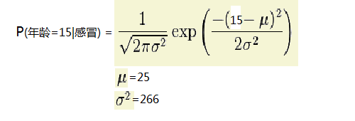 第三:把年龄=15 代入正太分布公式如下:参数代进去既可以求的P(age=15|感冒)的概率