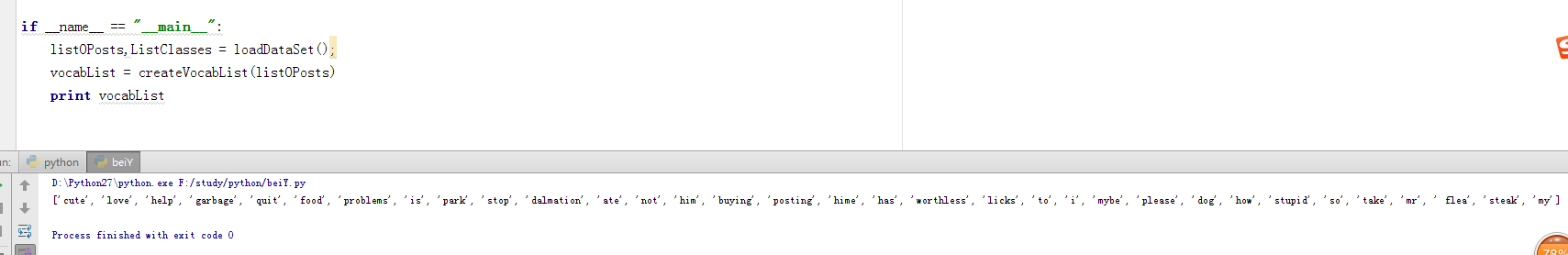def createVocabList(dataSet): vocabSet =set([]) for document in dataSet: vocabSet = vocabSet | set(document) return list(vocabSet)