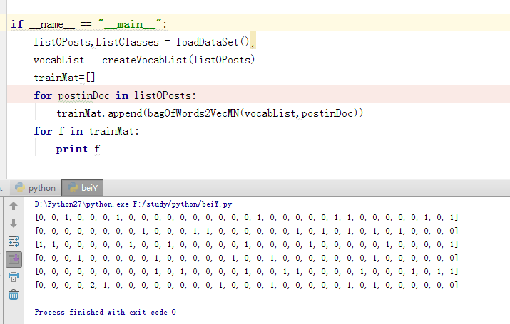 def bagOfWords2VecMN(vocabList,inputSet): returnVec =[0]*len(vocabList) for word in inputSet: returnVec[vocabList.index(word)] +=1 return returnVec