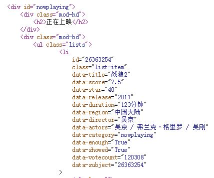 从上图中可以看出在div id=”nowplaying“标签开始是我们想要的数据,里面有电影的名称、评分、主演等信息。所以相应的代码编写如下: