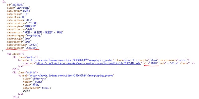 在上图中可以看到data-subject属性里面放了电影的id号码,而在img标签的alt属性里面放了电影的名字,因此我们就通过这两个属性来得到电影的id和名称。(注:打开电影短评的网页时需要用到电影的id,所以需要对它进行解析),编写代码如下: