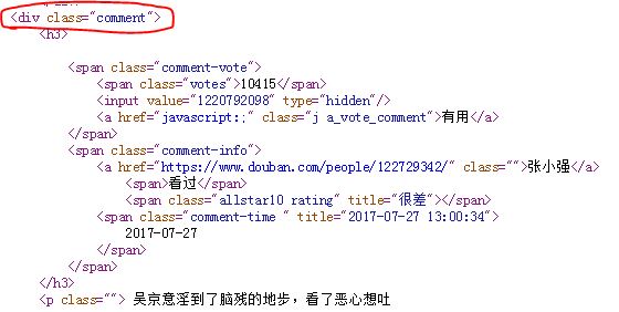 接下来接对该网址进行解析了。打开上图中的短评页面的html代码,我们发现关于评论的数据是在div标签的comment属性下面,如下图所示: