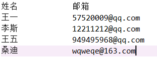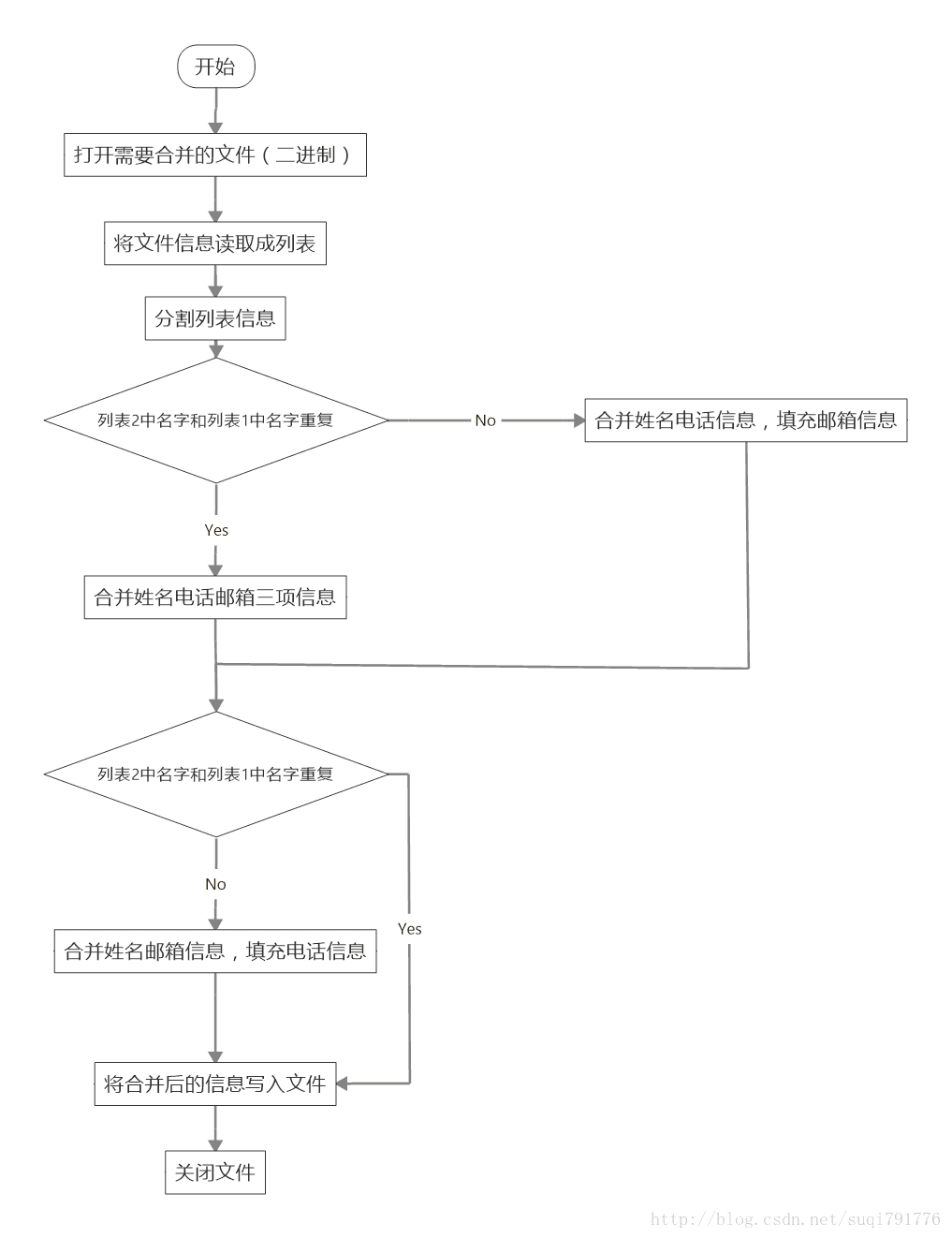 要将两个文件合并,首先要将文件读到内存中,成为列表。再将列表分割,按照类别将数据分开存储,即姓名、电话、邮箱。通过遍历列表1,依次与列表2比较,如果二者有重合的人,那么直接利用 .join([ ])姓名电话邮箱合并到一行,保存到另外一个列表变量里面。二者不重合的人,说明只有列表1中才有,故将此人的邮箱信息用str(‘—–')代替。