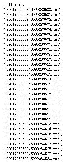 all.txt是我最后得到的结果文件。可以见返回的是一个包含txt文件名称的列表,当然如果你的文件夹下面只有txt文件,那么你用os.listdir()可以得到一个一样的列表