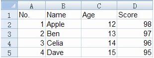 No.,Name,Age,Score 1,Apple,12,98 2,Ben,13,97 3,Celia,14,96 4,Dave,15,95