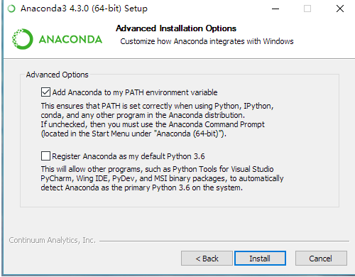 第一个勾是是否把Anaconda加入环境变量,这涉及到能否直接在cmd中使用conda、jupyter、ipython等命令,推荐打勾,如果不打勾话问题也不大,可以在之后使用Anaconda提供的命令行工具进行操作;第二个是是否设置Anaconda所带的Python 3.6为系统默认的Python版本,这个自己看着办,问题不大。