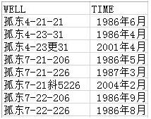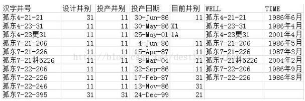 可以发现,A文件中“汉字井号”这一列和B文件中“WELL”这一列的属性相同,以这一列为主键,把B文件中“TIME”这一列数据添加到A文件中,如果B文件缺少某些行,则空着,最后A文件的行数不变,效果如下: