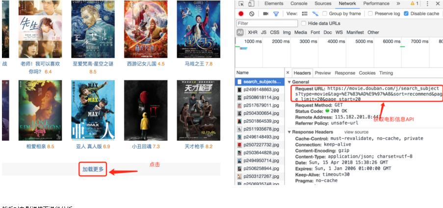首先,我们打开豆瓣电影·热门电影,会发现页面总共20部电影,但当查看页面源代码当时候,在源代码中根本找不到这些电影当信息。这是为什么呢?原来豆瓣在这里是通过ajax技术获取电影信息,再动态的将数据加载到页面中的。这就需要借助Chrome的开发者工具,先找到获取电影信息的API。