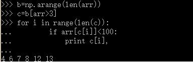 c=b[arr>3]#c存放的就是arr中大于3的元素对应的索引 #最后通过遍历c数组,选择3到100之间的值打印出来 for i in range(len(c)): if arr[c[i]]<100: print c[i],