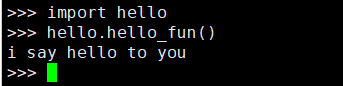 安装好模块之后,在python的交互环境中导入模块。模块就是hello.py文件,引用hello.py文件中的hello_fun()函数。