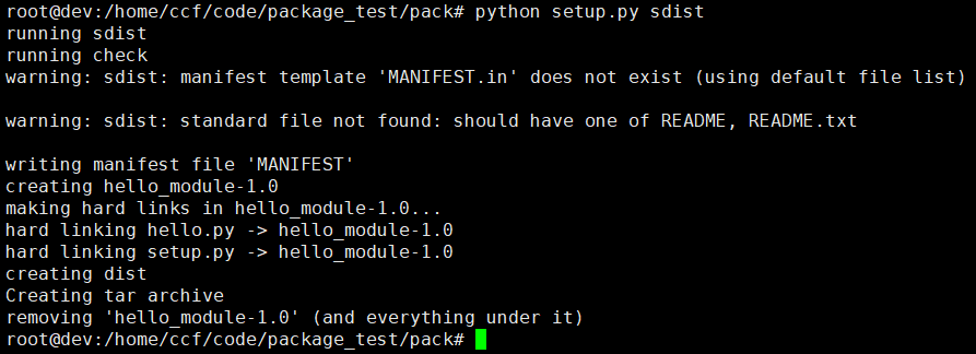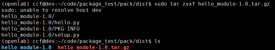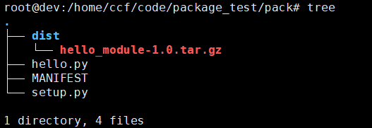 再次查看当前目录下自动生成了一个文件夹dist,文件夹中有一个压缩包即为我们的目标文件。另外有一个记录文件MANIFEST。