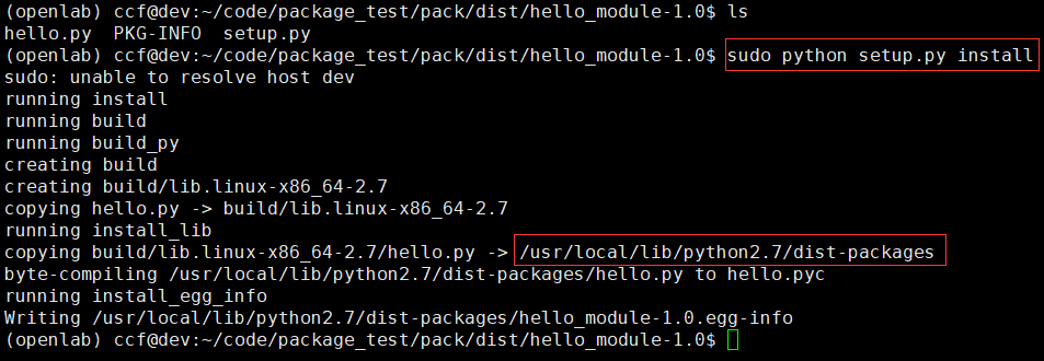hello_module-1.0.tar.gz 是生成的python模块。切换到的我的python虚拟环境中,安装该模块。
