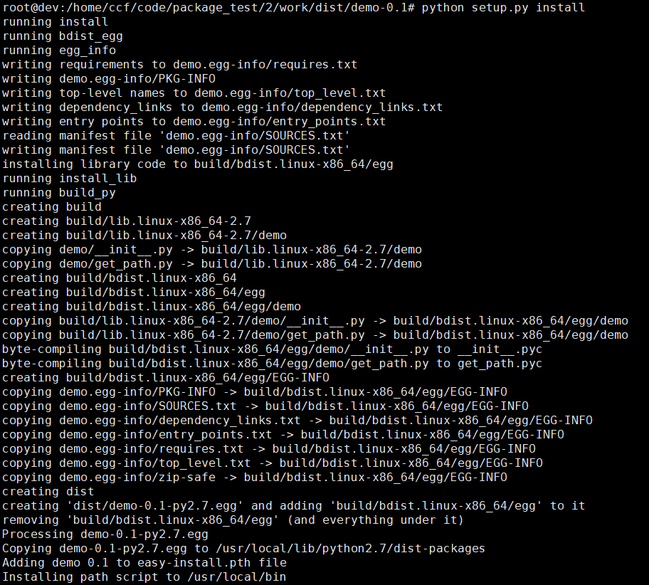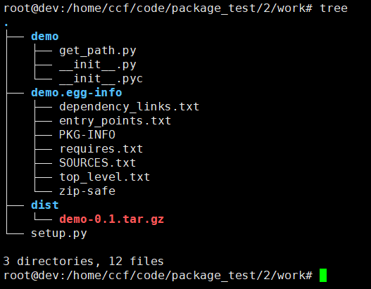 打包之后多出两个文件夹,分别是demo.egg-info和dist。demo.egg-info是必要的安装信息,而dist中的压缩包就是安装包。