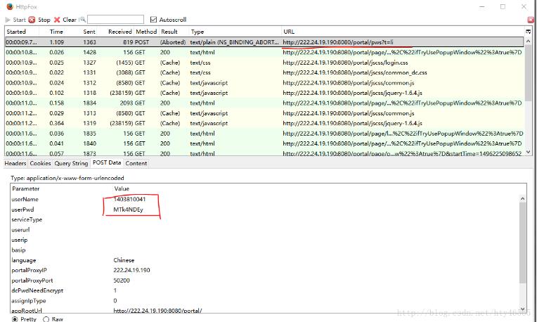 用firefox浏览器打开登录页面,并且打开httpfox插件。在页面中输入账户名和密码点击上线后,注意一下httpfox中有一行记录的Method是POST。我们需要记录的就是其中的POST Data中的userName和userPwd。以及Headers中的数据。还有POST到的URL地址。