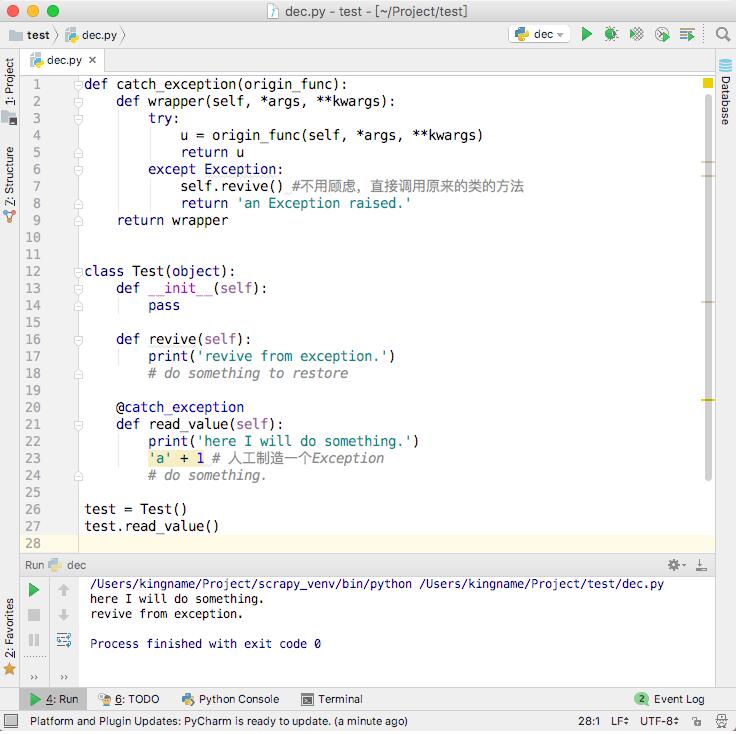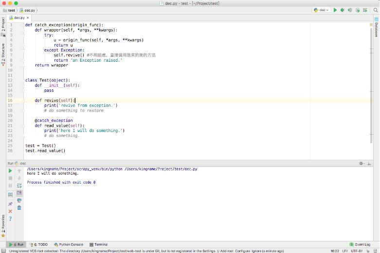 目前在中文网上能搜索到的绝大部分关于装饰器的教程,都在讲如何装饰一个普通的函数。本文介绍如何使用Python的装饰器装饰一个类的方法,同时在装饰器函数中调用类里面的其他方法。本文以捕获一个方法的异常为例来进行说明。