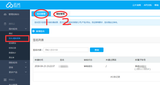 3.等待认证完成的短信通知,然后按照后台的操作指引,在【签名管理】页【新增签名】,在【模板管理】页【新增模板】,这些都要等待云片网的审核,审核通过会有短信通知。