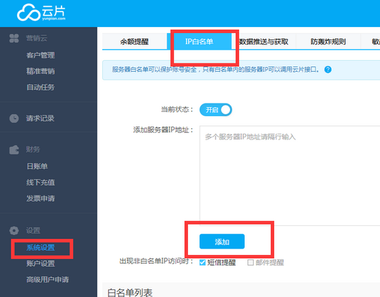4.在云片网后台设置ip白名单,将外网ip加入白名单