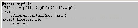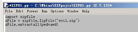 让我们来写一个脚本测试一下Zip文件库的用法,首先创建一个有密码的压缩文件,这里设置密码为awd,文件名为evil.zip,要解压这个zip文件,实例化一个新的ZipFile类,使用extractall()方法,在可选参数pwd上填上密码