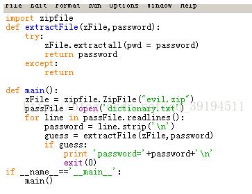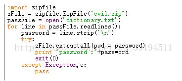 我们可以用抛出的异常测试我们的字典文件,在这里为了简便直接新建了一个“dictionary.txt”文件,其中有zip文件的密码,我们需要遍历字典中的每个单词。如果extractall执行成功则输出密码,否则抛出异常,忽略这个异常,再测试下一个密码。