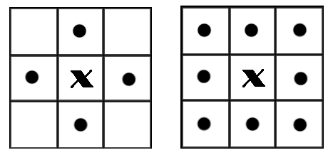在二值图像中,如果两个像素点相邻且值相同(同为0或同为1),那么就认为这两个像素点在一个相互连通的区域内。而同一个连通区域的所有像素点,都用同一个数值来进行标记,这个过程就叫连通区域标记。在判断两个像素是否相邻时,我们通常采用4连通或8连通判断。在图像中,最小的单位是像素,每个像素周围有8个邻接像素,常见的邻接关系有2种:4邻接与8邻接。4邻接一共4个点,即上下左右,如下左图所示。8邻接的点一共有8个,包括了对角线位置的点,如下右图所示。