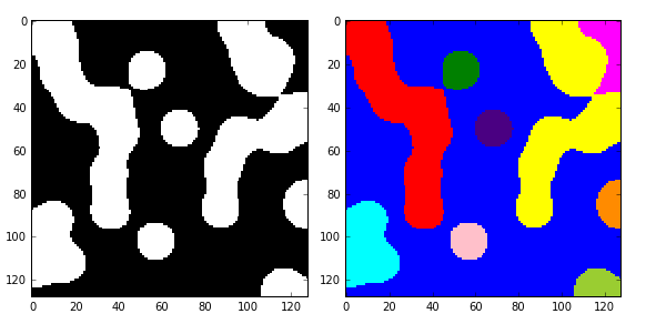 import numpy as np import scipy.ndimage as ndi from skimage import morphology import matplotlib.pyplot as plt #编写一个函数来生成原始二值图像 def microstructure(l=256): n = 5 x, y = np.ogrid[0:l, 0:l] #生成网络 mask = np.zeros((l, l)) generator = np.random.RandomState(1) #随机数种子 points = l * generator.rand(2, n**2) mask[(points[0]).astype(np.int), (points[1]).astype(np.int)] = 1 mask = ndi.gaussian_filter(mask, sigma=l/(4.*n)) #高斯滤波 return mask > mask.mean() data = microstructure(l=128) #生成测试图片 dst=morphology.remove_small_objects(data,min_size=300,connectivity=1) fig, (ax1, ax2) = plt.subplots(1, 2, figsize=(8, 4)) ax1.imshow(data, plt.cm.gray, interpolation='nearest') ax2.imshow(dst,plt.cm.gray,interpolation='nearest') fig.tight_layout() plt.show()