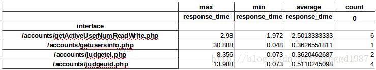 通过分析nginx访问日志,获取每个接口响应时间最大值、最小值、平均值及访问量。