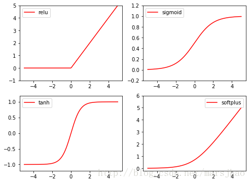 import torch import torch.nn.functional as F from torch.autograd import Variable import matplotlib.pyplot as plt x = torch.linspace(-5, 5, 200) x_variable = Variable(x) #将x放入Variable x_np = x_variable.data.numpy() # 经过4种不同的激励函数得到的numpy形式的数据结果 y_relu = F.relu(x_variable).data.numpy() y_sigmoid = F.sigmoid(x_variable).data.numpy() y_tanh = F.tanh(x_variable).data.numpy() y_softplus = F.softplus(x_variable).data.numpy() plt.figure(1, figsize=(8, 6)) plt.subplot(221) plt.plot(x_np, y_relu, c='red', label='relu') plt.ylim((-1, 5)) plt.legend(loc='best') plt.subplot(222) plt.plot(x_np, y_sigmoid, c='red', label='sigmoid') plt.ylim((-0.2, 1.2)) plt.legend(loc='best') plt.subplot(223) plt.plot(x_np, y_tanh, c='red', label='tanh') plt.ylim((-1.2, 1.2)) plt.legend(loc='best') plt.subplot(224) plt.plot(x_np, y_softplus, c='red', label='softplus') plt.ylim((-0.2, 6)) plt.legend(loc='best') plt.show()