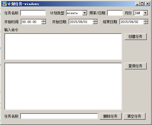 “任务名称”填写任务的名字,计划类型选择时间,频率填写次数,在计划类型中除了monthly之外的其他类型都填写频率,monthly时日期填写日期号数,月份也只在选择monthly时候需要选择,其他时候不用选择,月份中*号问任意月,接着填写开始时间、开始日期、结束日期,结束日期要大于开始日期,最后填写所要执行的命令,则任务创建成功。,创建任务后随时可以查阅任务,点击查询任务即可,删除任务只要填上要删除的任务名称,点击删除任务即可,清空任务为删除所有任务。
