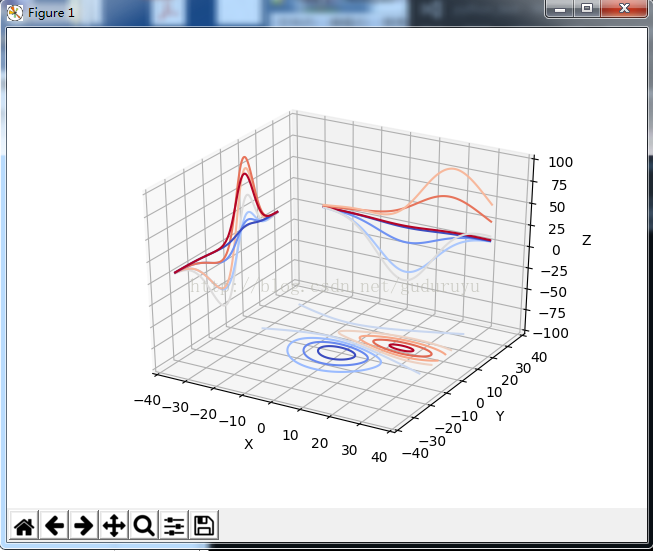 cset = ax.contour(X, Y, Z, zdir='x', offset=-40, cmap=cm.coolwarm)