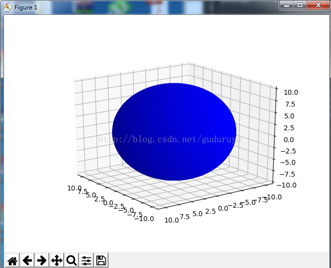 from mpl_toolkits.mplot3d import Axes3D import matplotlib.pyplot as plt import numpy as np fig = plt.figure() ax = fig.add_subplot(111, projection='3d') # Make data u = np.linspace(0, 2 * np.pi, 100) v = np.linspace(0, np.pi, 100) x = 10 * np.outer(np.cos(u), np.sin(v)) y = 10 * np.outer(np.sin(u), np.sin(v)) z = 10 * np.outer(np.ones(np.size(u)), np.cos(v)) # Plot the surface ax.plot_surface(x, y, z, color='b') plt.show()