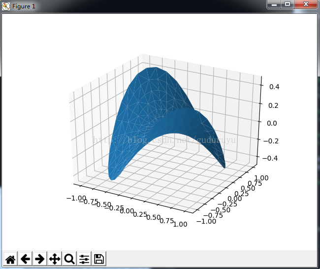 from mpl_toolkits.mplot3d import Axes3D import matplotlib.pyplot as plt import numpy as np n_radii = 8 n_angles = 36 # Make radii and angles spaces (radius r=0 omitted to eliminate duplication). radii = np.linspace(0.125, 1.0, n_radii) angles = np.linspace(0, 2*np.pi, n_angles, endpoint=False) # Repeat all angles for each radius. angles = np.repeat(angles[..., np.newaxis], n_radii, axis=1) # Convert polar (radii, angles) coords to cartesian (x, y) coords. # (0, 0) is manually added at this stage, so there will be no duplicate # points in the (x, y) plane. x = np.append(0, (radii*np.cos(angles)).flatten()) y = np.append(0, (radii*np.sin(angles)).flatten()) # Compute z to make the pringle surface. z = np.sin(-x*y) fig = plt.figure() ax = fig.gca(projection='3d') ax.plot_trisurf(x, y, z, linewidth=0.2, antialiased=True) plt.show(
