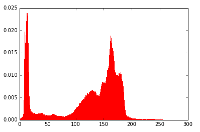 n, bins, patches = plt.hist(arr, bins=256, normed=1,edgecolor='None',facecolor='red')