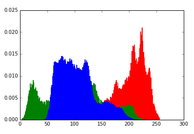 from skimage import data import matplotlib.pyplot as plt img=data.lena() ar=img[:,:,0].flatten() plt.hist(ar, bins=256, normed=1,facecolor='r',edgecolor='r',hold=1) ag=img[:,:,1].flatten() plt.hist(ag, bins=256, normed=1, facecolor='g',edgecolor='g',hold=1) ab=img[:,:,2].flatten() plt.hist(ab, bins=256, normed=1, facecolor='b',edgecolor='b') plt.show()