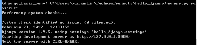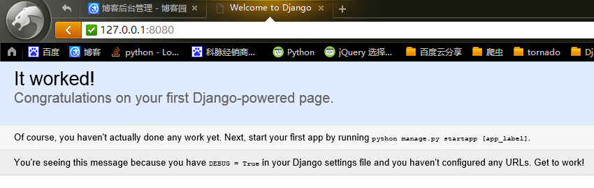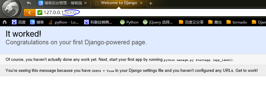 我们启动django开发服务器,输入命令 manage.py runserver 默认的端口是8000.