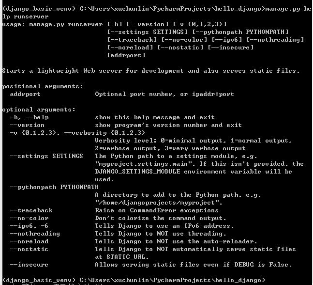 我们先停掉django的服务,按ctrl + c 就可以停掉服务 。然后查看django的runserver的命令解释。