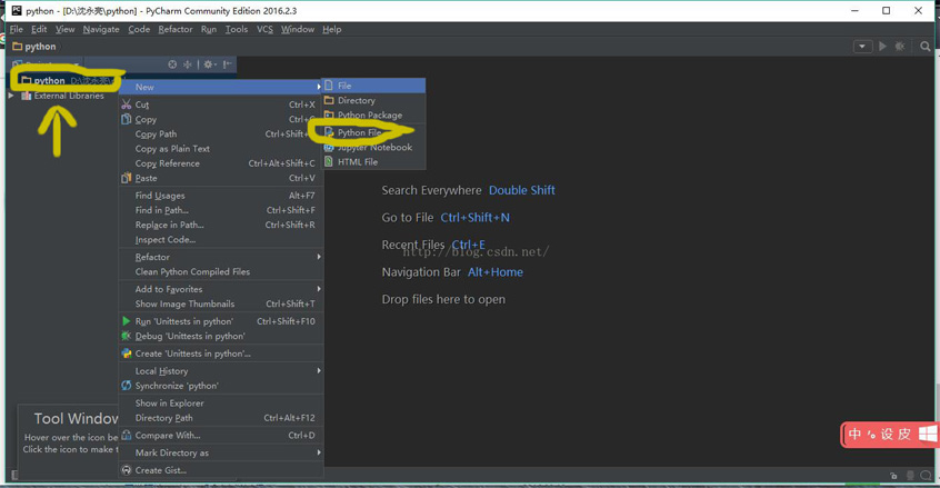 6、在进入的界面如下图,鼠标右击图中箭头指向的地方,然后最后选择python file,在弹出的框中填写文件名(任意填写)。