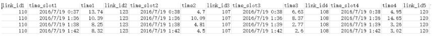 DF=DF2.reindex(columns=['link_id1','time_slot1','time1','link_id2','time_slot2','time2','link_id3','time_slot3','time3','link_id4','time_slot4','time4','link_id5','time_slot5','time5','link_id6','time_slot6','time6','all_time'])