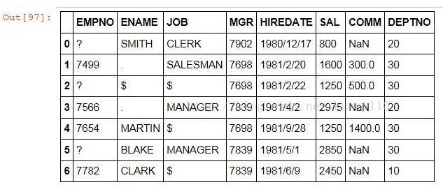 df.replace({'EMPNO':'?','ENAME':'.'},np.nan)#用np.nan替换EMPNO列中?和ENAME中.