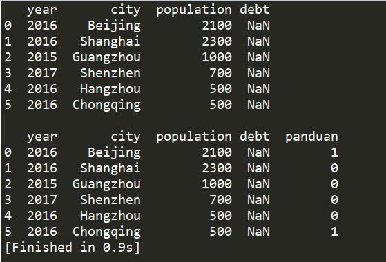 如代码所示,判断如果城市名中含有ing字段且年份为2016,则新列test值赋为1,否则为0.
