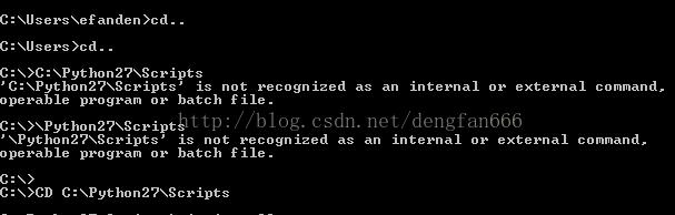 比如我的在C:\Python27\Scripts这个目录下,先切换到d盘,再进入这个路径。