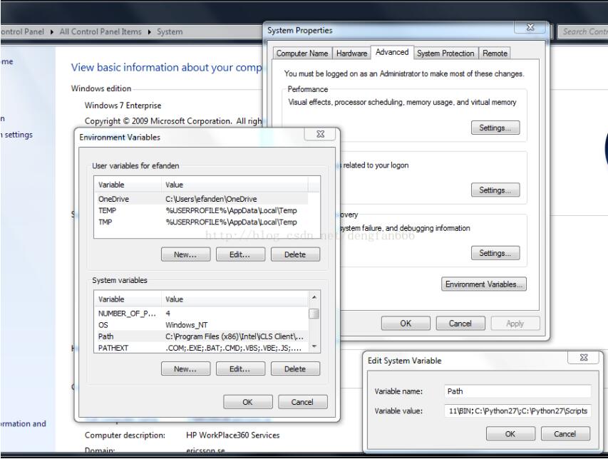 依次点击我的电脑,Properties,接着点击高级系统设置,环境变量,然后把C:\Python27\Scripts路径添加到变量值里面就行了。