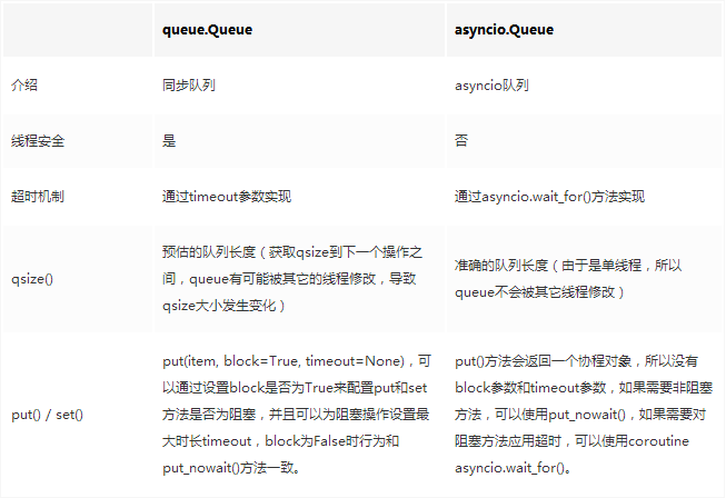区别在于queue.Queue适用于多线程的场景,asyncio.Queue适用于协程场景下的通信,由于asyncio的加成,queue.Queue下的阻塞接口在asyncio.Queue中则是以返回协程对象的方式执行,具体差异如下表: