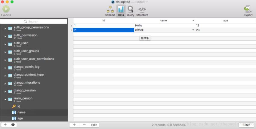 4、使用SQLite Expert Personal软件查看并编辑db.sqlite3, 并向其插入数据