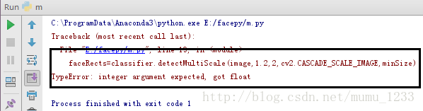 由于minSize传到detectMultiScale函数的值不是整数导致的导致出现错误,所以这里我们需要强制转换minSize的值为整数: minSize =(w//divisor, h//divisor) 或者 minSize=(int(w/divisor),int(h/divisor))