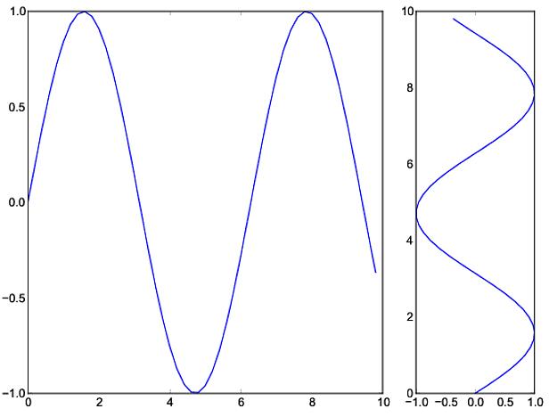 import numpy as np import matplotlib.pyplot as plt from matplotlib import gridspec x = np.arange(0, 10, 0.2) y = np.sin(x) fig = plt.figure(figsize=(8, 6)) gs = gridspec.GridSpec(1, 2, width_ratios=[3, 1]) ax0 = plt.subplot(gs[0]) ax0.plot(x, y) ax1 = plt.subplot(gs[1]) ax1.plot(y, x) plt.tight_layout() plt.savefig(‘grid_figure.pdf')