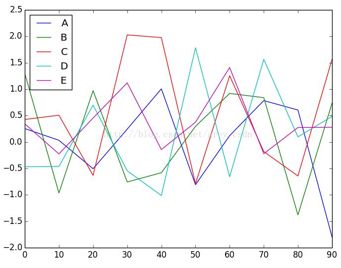 from pandas import Series,DataFrame from numpy.random import randn import numpy as np import matplotlib.pyplot as plt df = DataFrame(randn(10,5),columns=['A','B','C','D','E'],index = np.arange(0,100,10)) df.plot() plt.show()