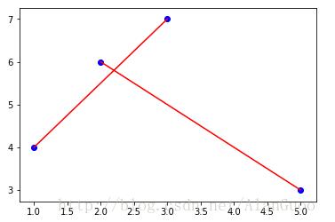 import matplotlib.pyplot as plt x = [[1, 3], [2, 5]] # 要连接的两个点的坐标 y = [[4, 7], [6, 3]] for i in range(len(x)): plt.plot(x[i], y[i], color='r') plt.scatter(x[i], y[i], color='b')