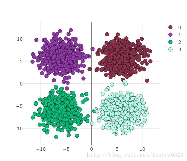 use_gpu = True ones = np.ones((500,2)) x1 = torch.normal(6*torch.from_numpy(ones),2) y1 = torch.zeros(500) x2 = torch.normal(6*torch.from_numpy(ones*[-1,1]),2) y2 = y1 +1 x3 = torch.normal(-6*torch.from_numpy(ones),2) y3 = y1 +2 x4 = torch.normal(6*torch.from_numpy(ones*[1,-1]),2) y4 = y1 +3 x = torch.cat((x1, x2, x3 ,x4), 0).float() y = torch.cat((y1, y2, y3, y4), ).long()