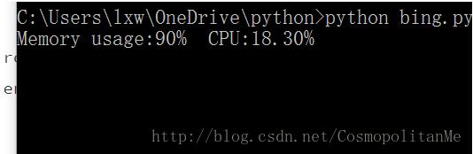 #先下载psutil库:pip install psutil import psutil import os,datetime,time def getMemCpu(): data = psutil.virtual_memory() total = data.total #总内存,单位为byte free = data.available #可以内存 memory = "Memory usage:%d"%(int(round(data.percent)))+"%"+" " cpu = "CPU:%0.2f"%psutil.cpu_percent(interval=1)+"%" return memory+cpu def main(): while(True): info = getMemCpu() time.sleep(0.2) print info+"\b"*(len(info)+1), if __name__=="__main__": main()